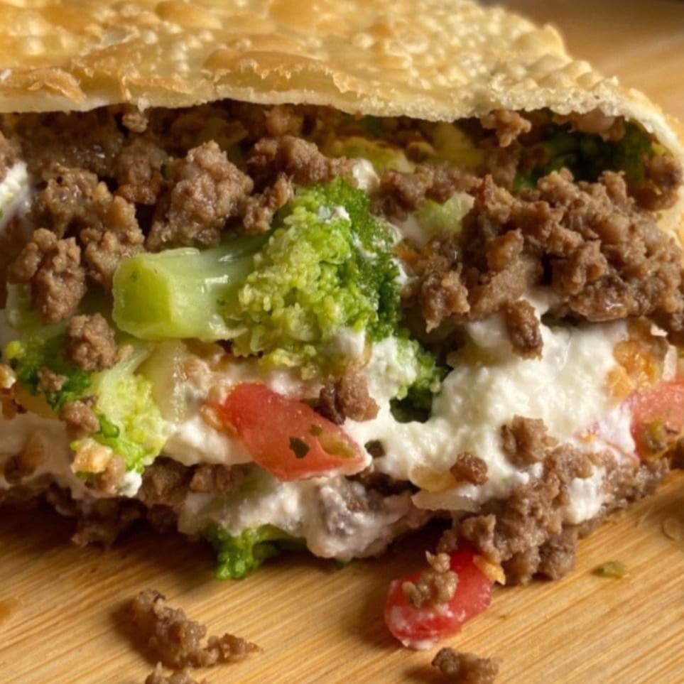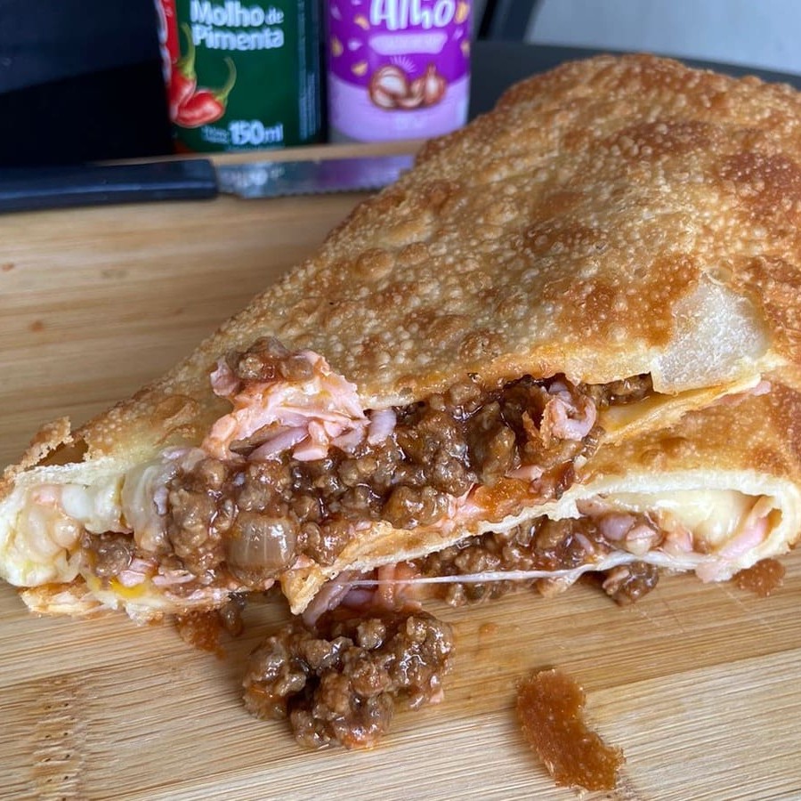 Pastel de Carne moida temperada com cheddar 20cm, recheio de ponta a ponta