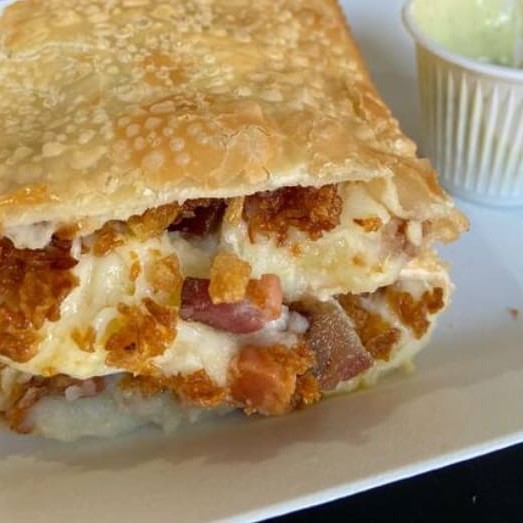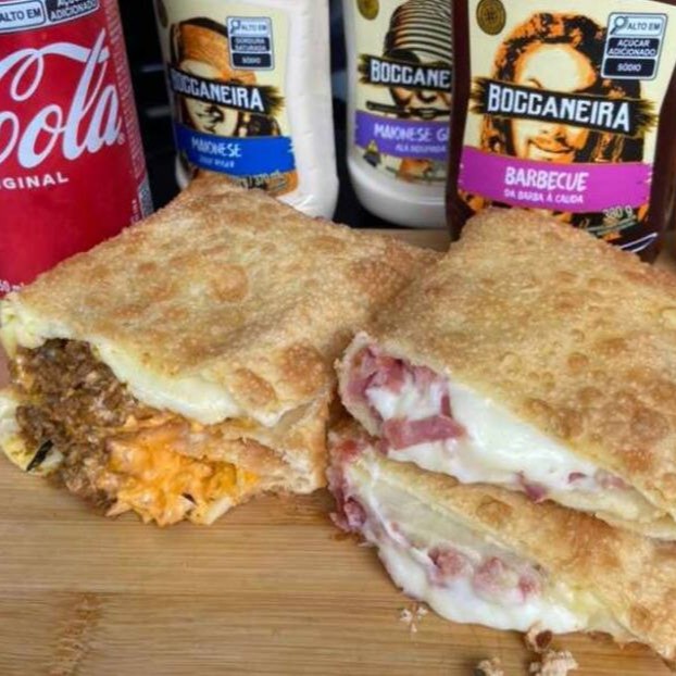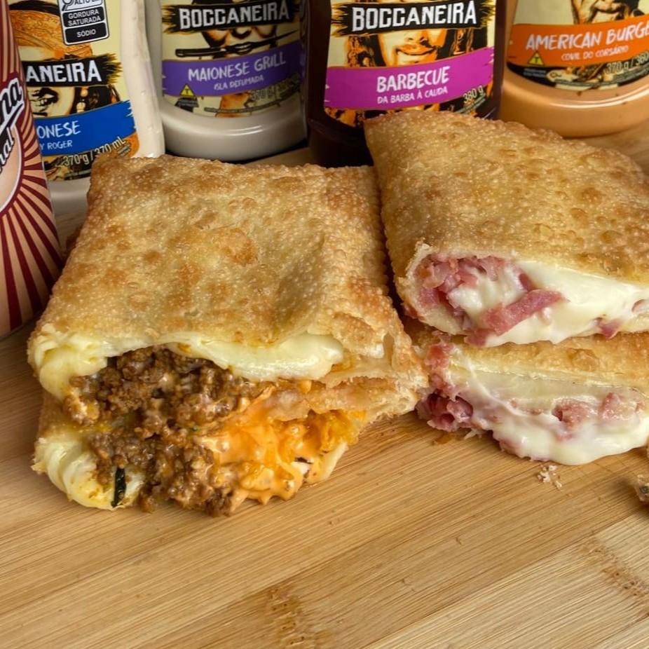 Pastel de 20cm de queijo mussarela, cheddar, Catupiry e parmesão recheio de ponta a ponta