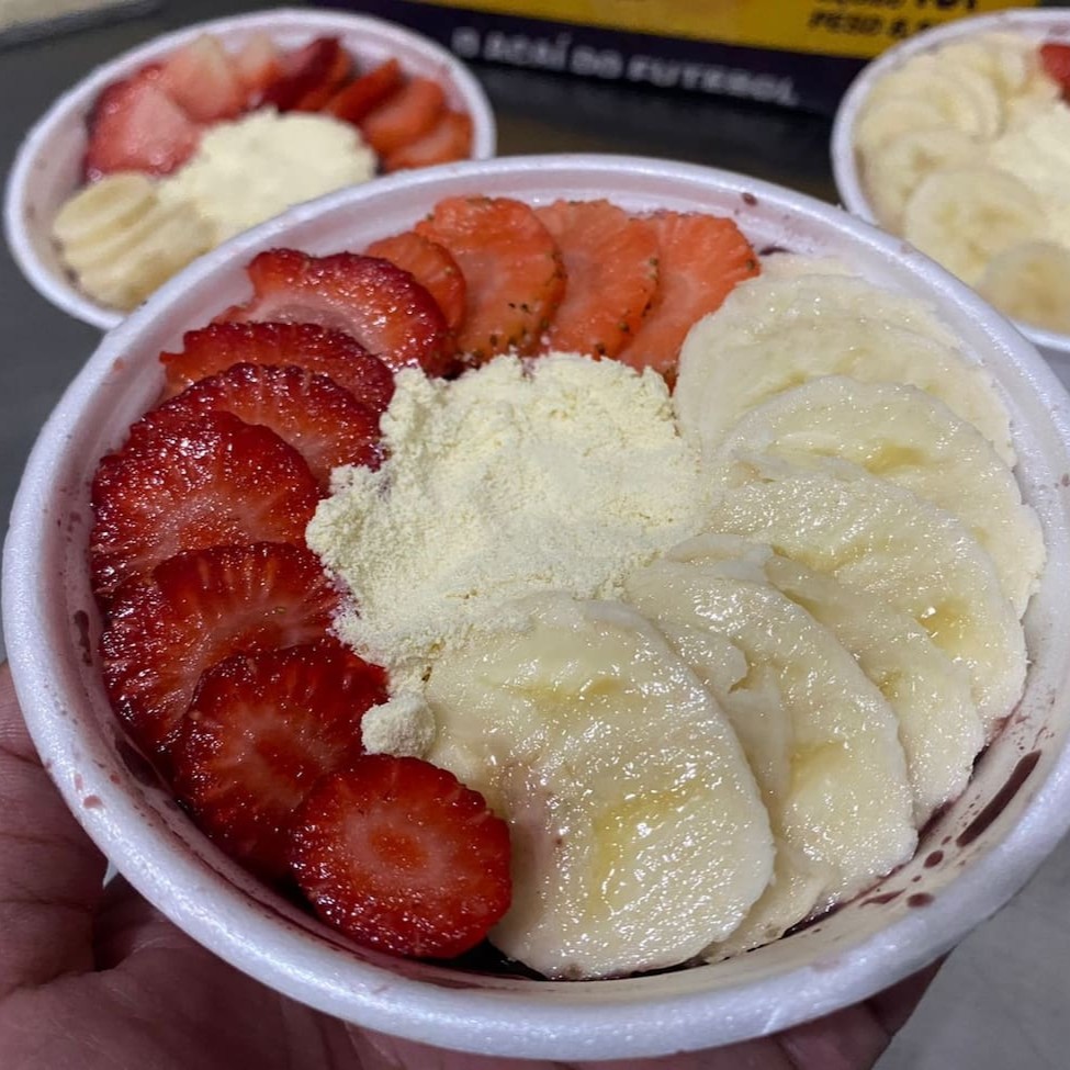 Nosso açaí, de marca renomada 'Frutas Brasileiras', é considerado o melhor do mercado, oferecendo uma experiência inigualável de sabor e frescor. Monte seu açaí com até 4 acompanhamentos, produtos de alta qualidade e frutas frescas