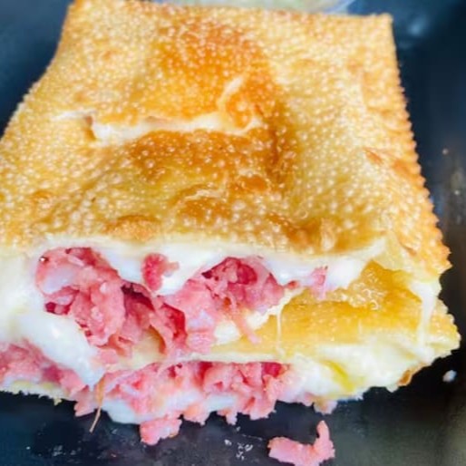 Pastel de frango desfiado com Cream Cheese, recheio de ponta a ponta