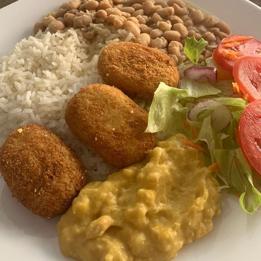 3 unidades de nuggets da incrivel, companha arroz, pure de bata, feijão e salada <3