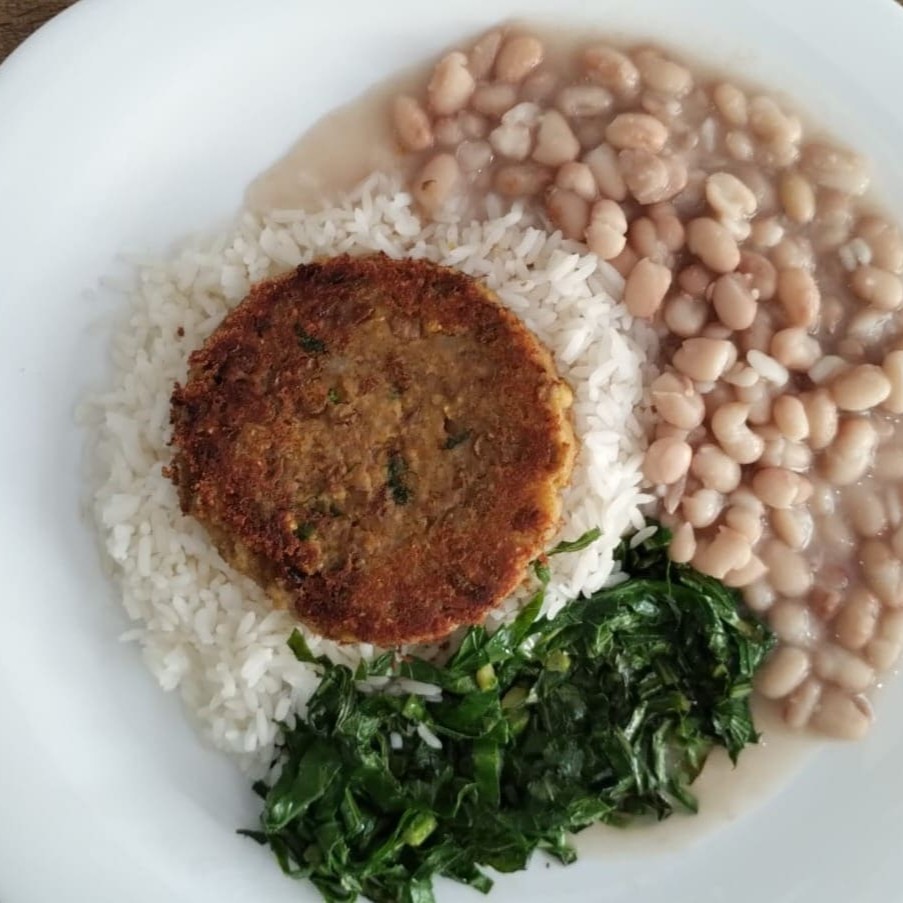 Delicioso hambúrguer de lentilha, acompanha arroz, feijão e couve <3 aproximadamente 375g a 400g