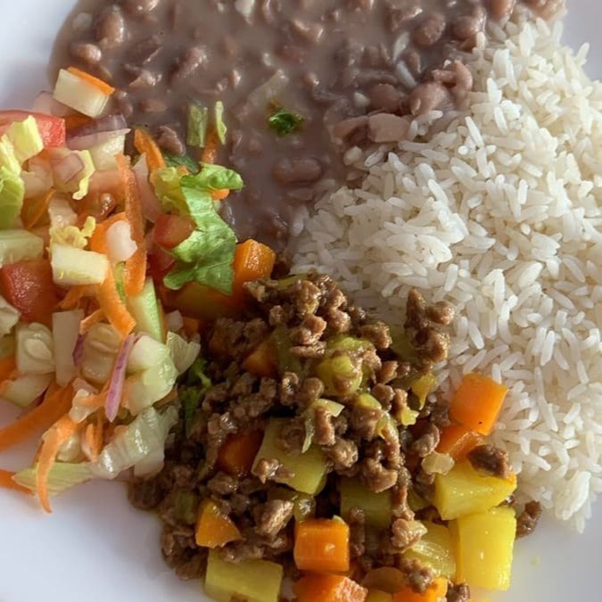Proteína texturizada de soja temperada com legumes cozidos, acompanha arroz, feijão e salada