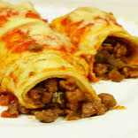 2 unidades de panqueca recheada com bolonhesa, coberta com molho temperado e uma camada de cheddar por cima.