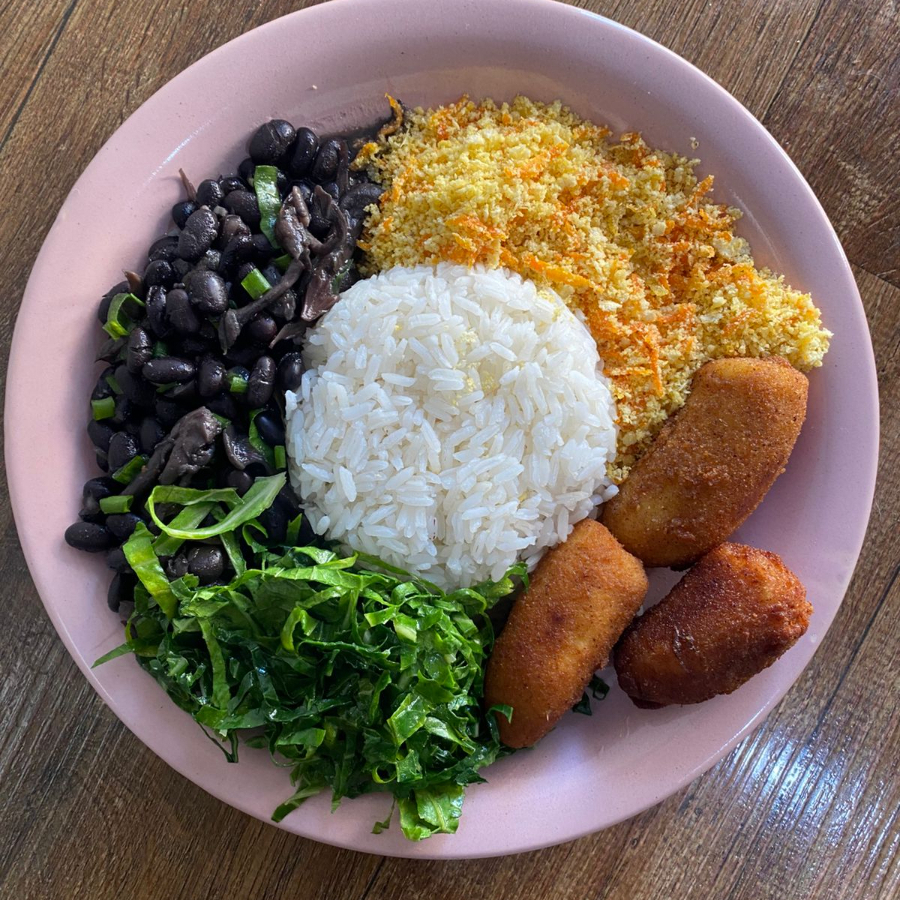 Feijão preto com shimeji, arroz, banana empanada, farofa e couve. completo e cheio de sabor <3