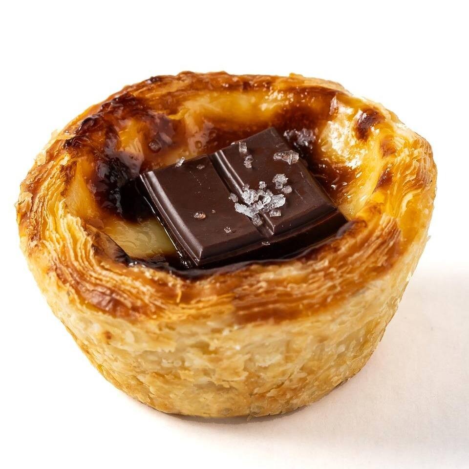 Pastel de nata com chocolate Mission 65% dentro e na cobertura + flor de sal. Obs: este item pode chegar avariado por possuir cobertura.