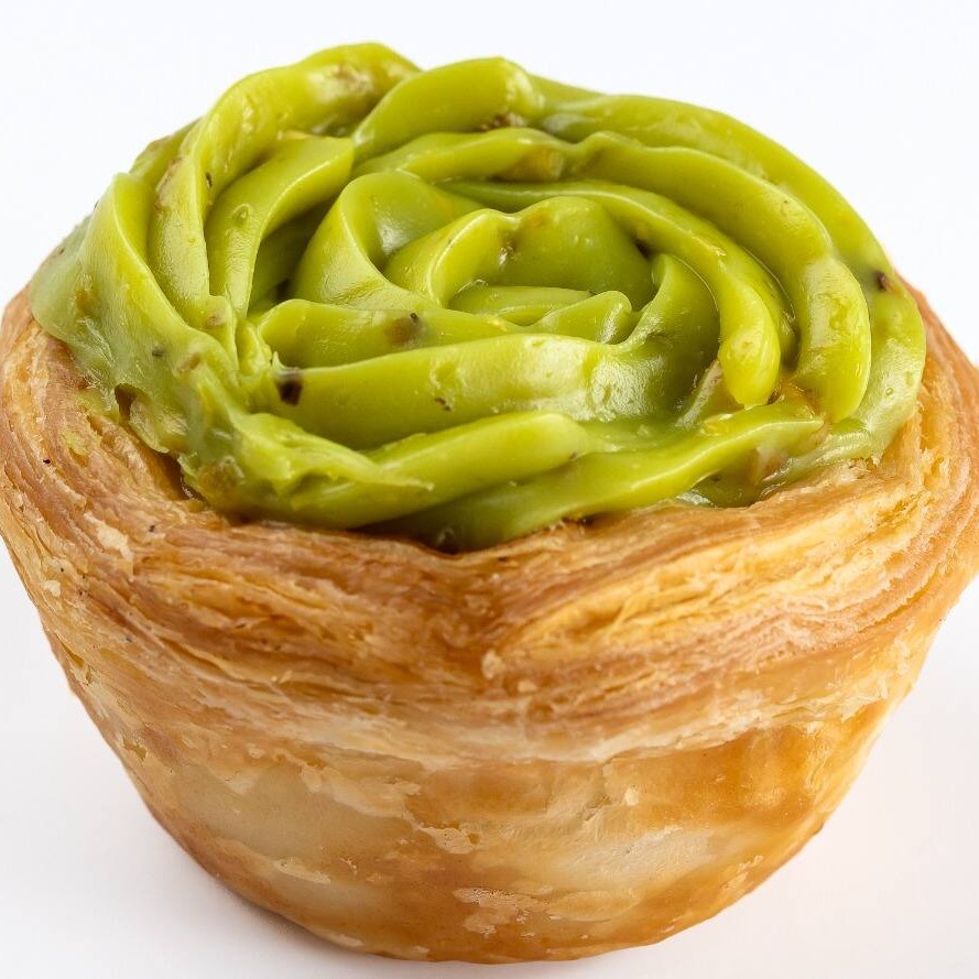 Pastel de nata com creme de pistache. Obs: este item pode chegar avariado por possuir cobertura.