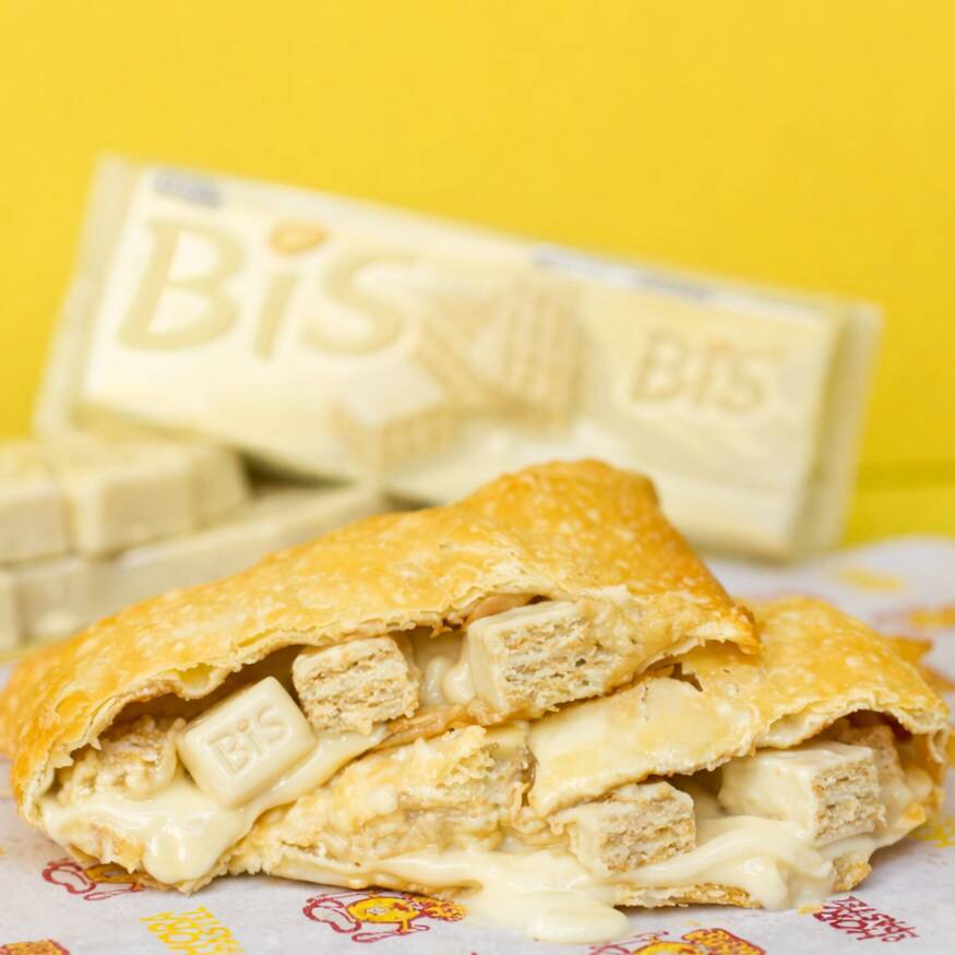 Recheio: Chocolate branco cremoso e pedaços de Bis branco.