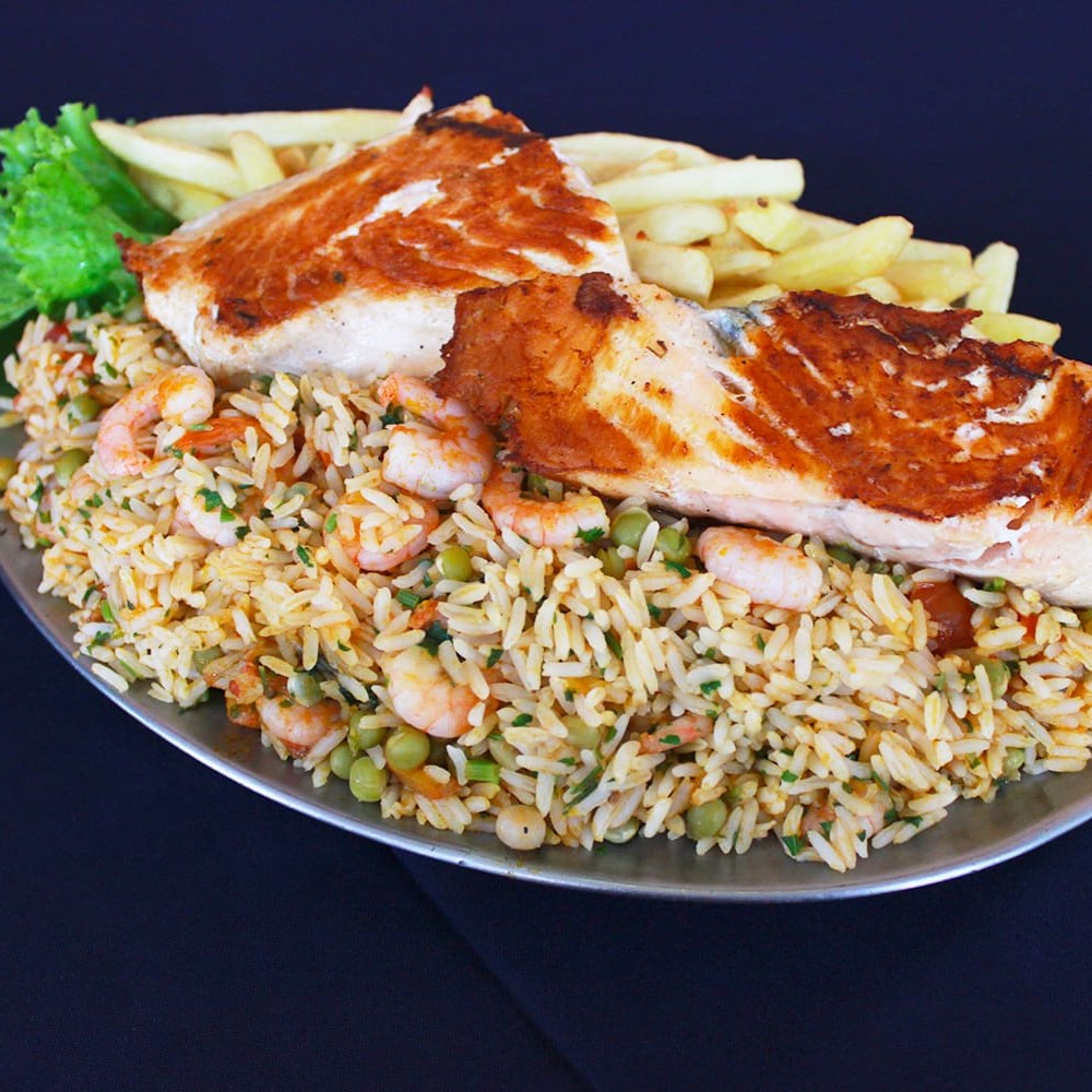 Salmão grelhado, cebola murcha no azeite, alcaparra, azeitona verde, camarão, champignon, batata souté, e arroz.