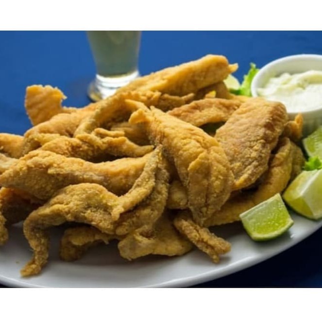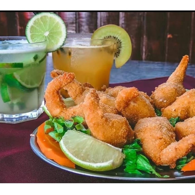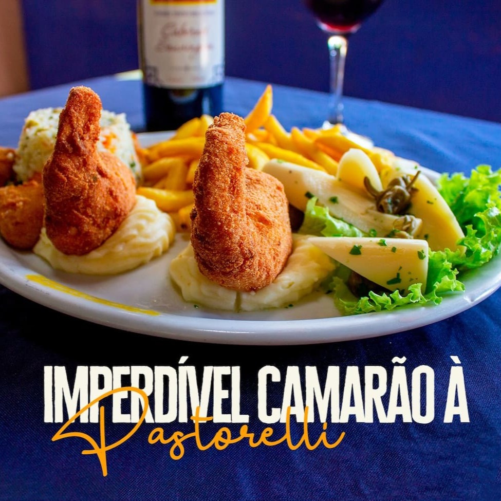 2 camarões Grandes recheados com Catupiry e empanados. Acompanha arroz a grega, palmito e alcaparras salteados na manteiga, provolone a milanesa e batata frita.