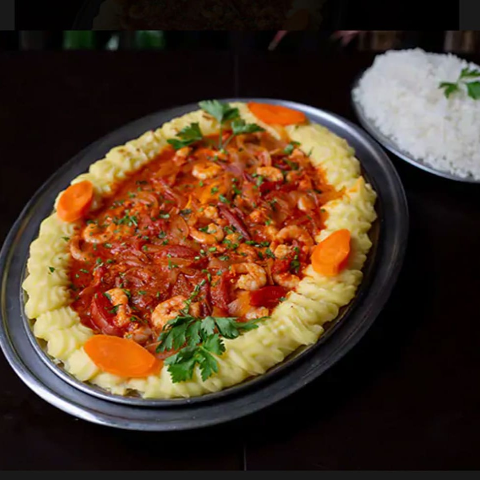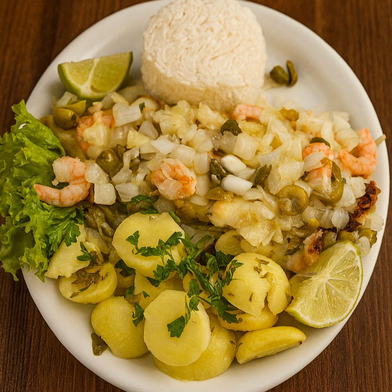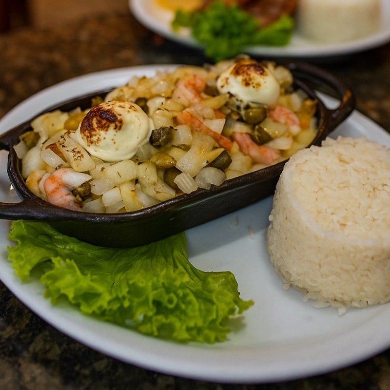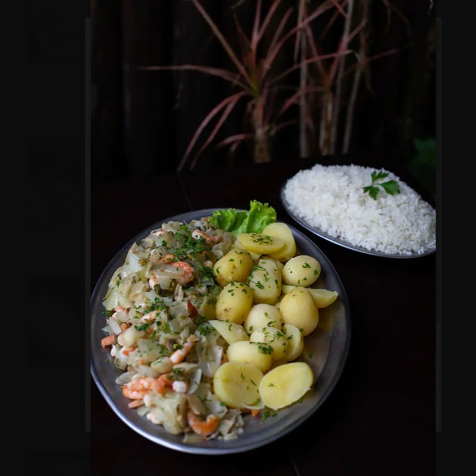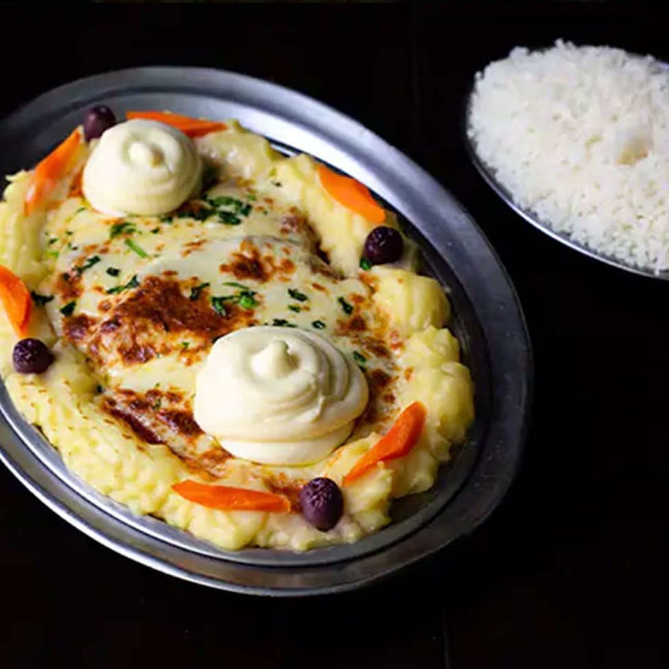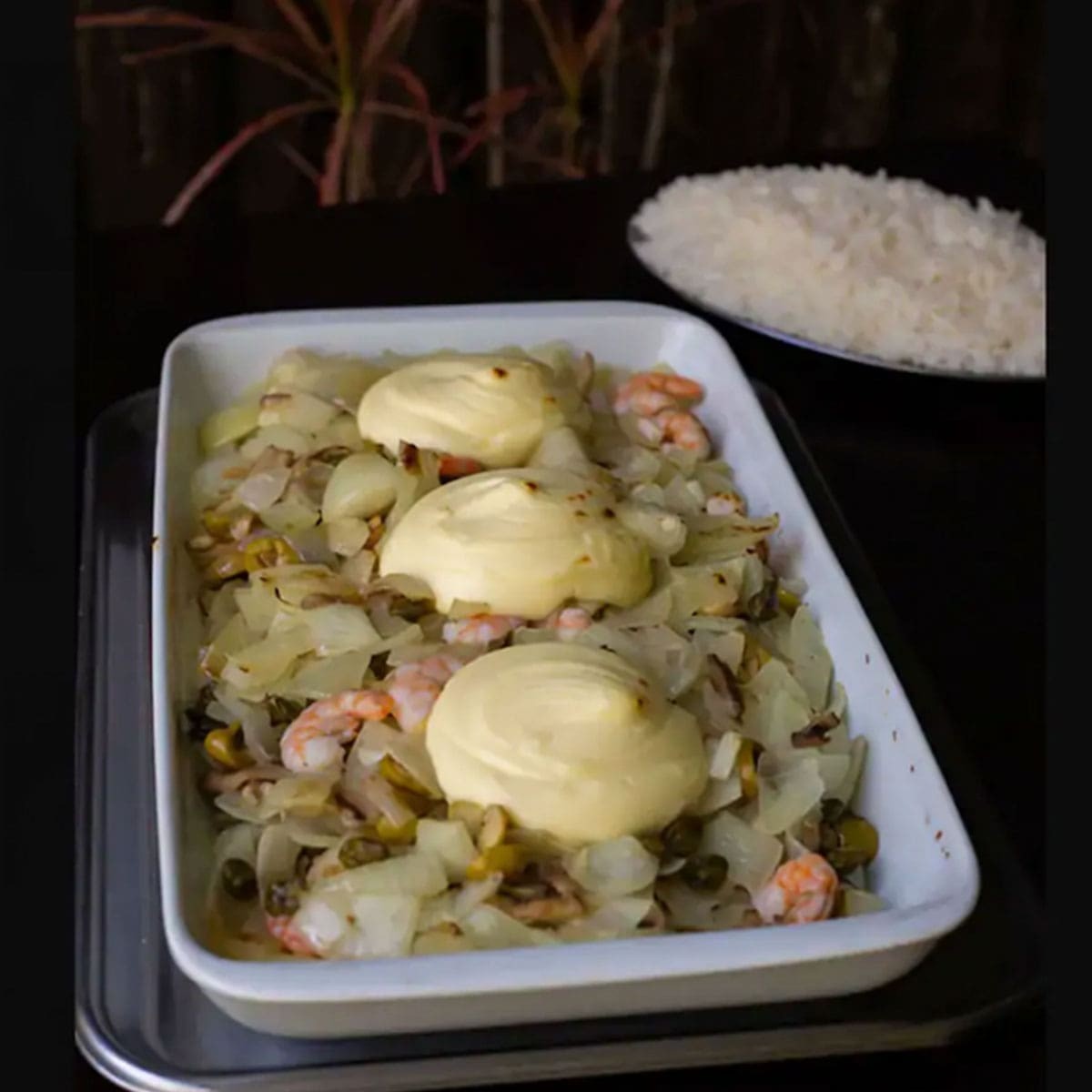 Abadejo grelhado, creme de purê de batatas, cebola murcha no azeite, alcaparras, azeitonas verde, camarão, champignon, catupiry e arroz branco.