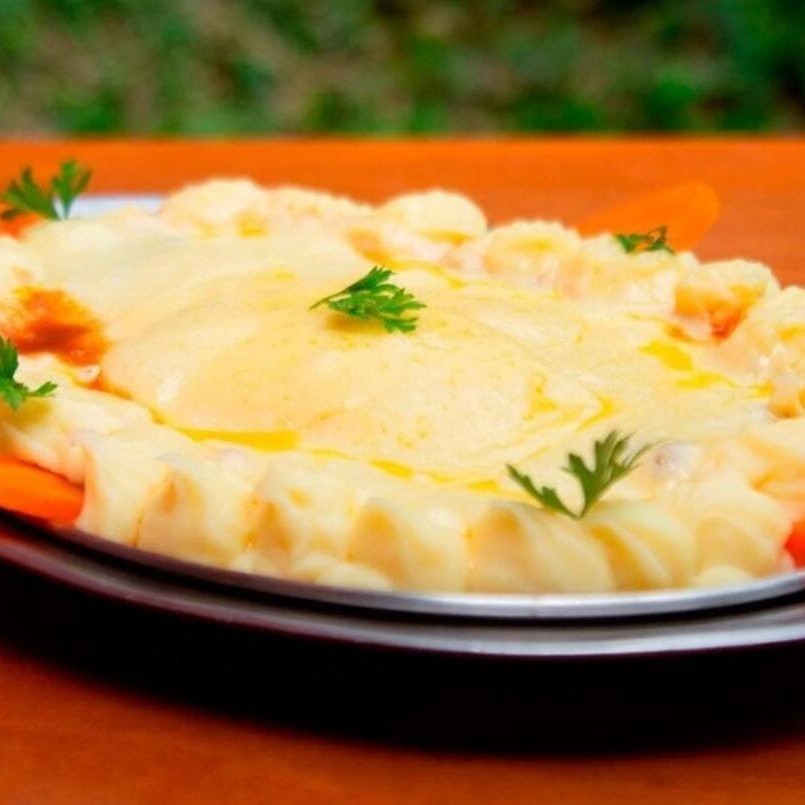 Pescada grelhada, creme de purê de batata, cebola murcha no azeite, alcaparra, azeitona verde, camarão, champignon, Catupiry e arroz.
