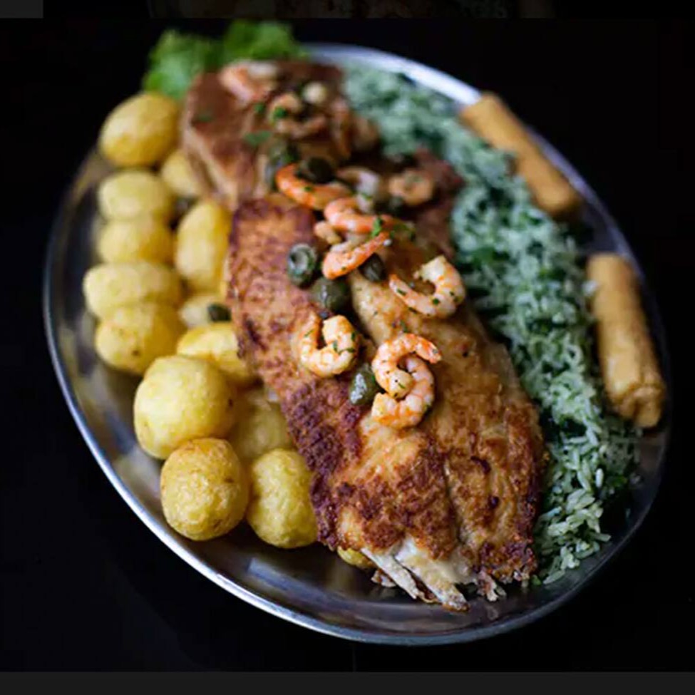 Tilápia grelhada, arroz com brócolis, 1 palmito à milanesa, alcaparras, camarão no azeite e batatas coradas