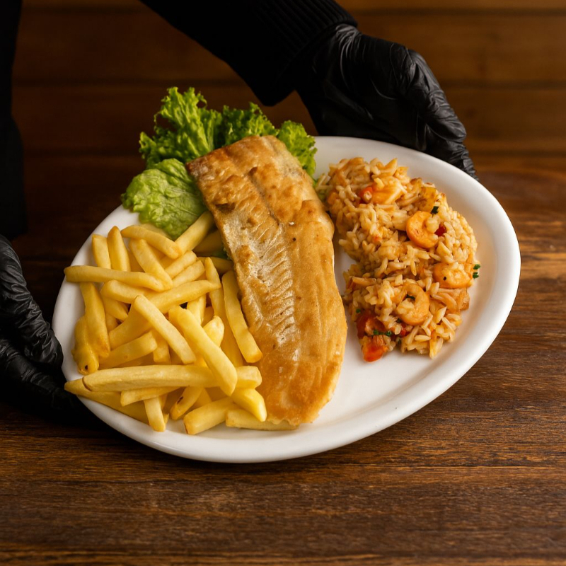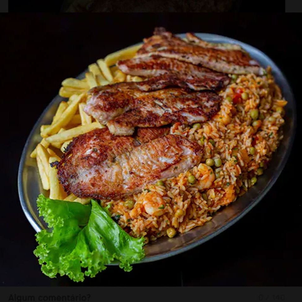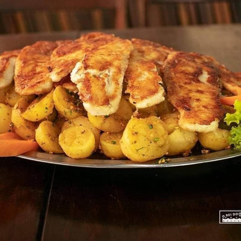 Filé de tilápia grelhada. Acompanha batatas coradas temperadas com alho, orégano e azeite, Arroz com bacalhau desfiado, cebola, alho e tomate.
