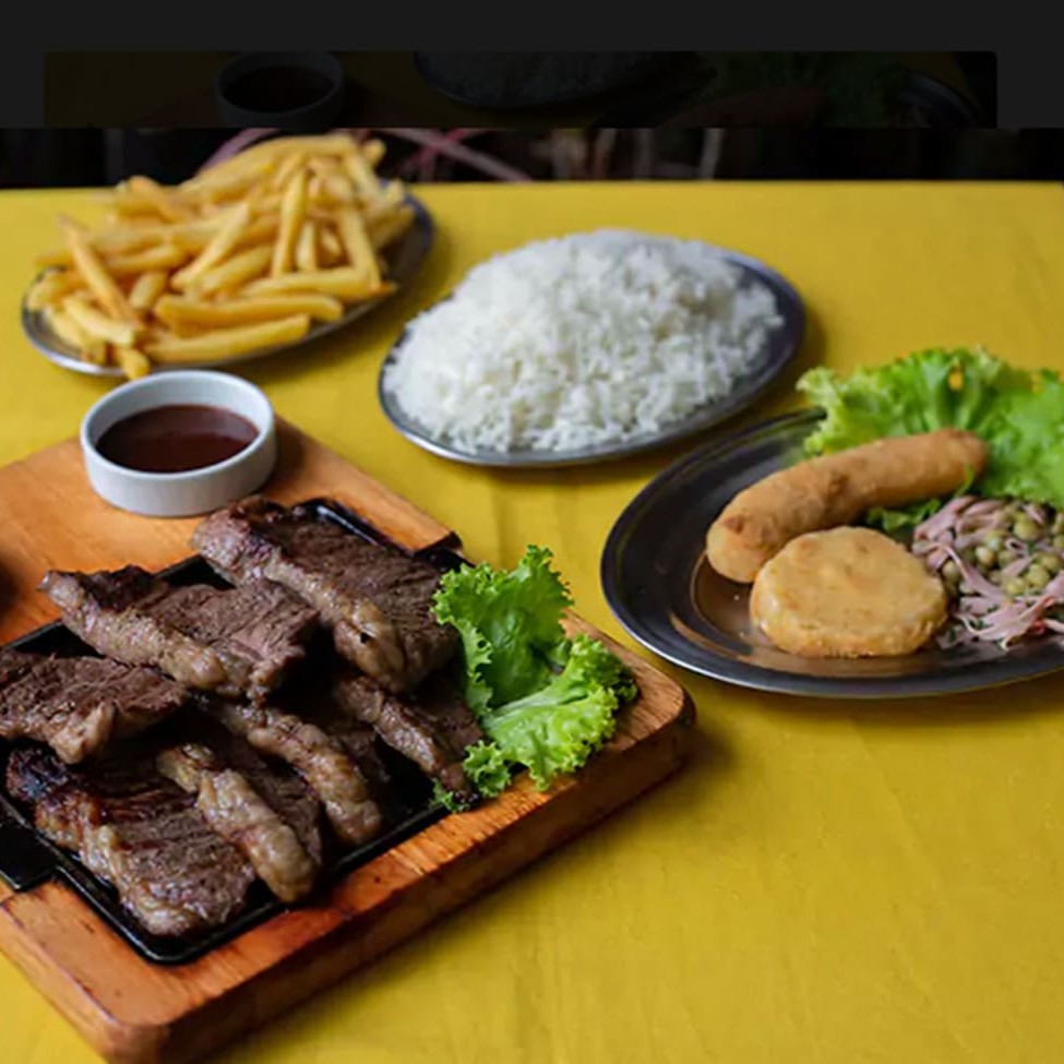 Picanha grelhada, banana à milanesa, batata frita e arroz à grega.