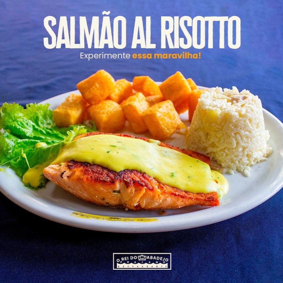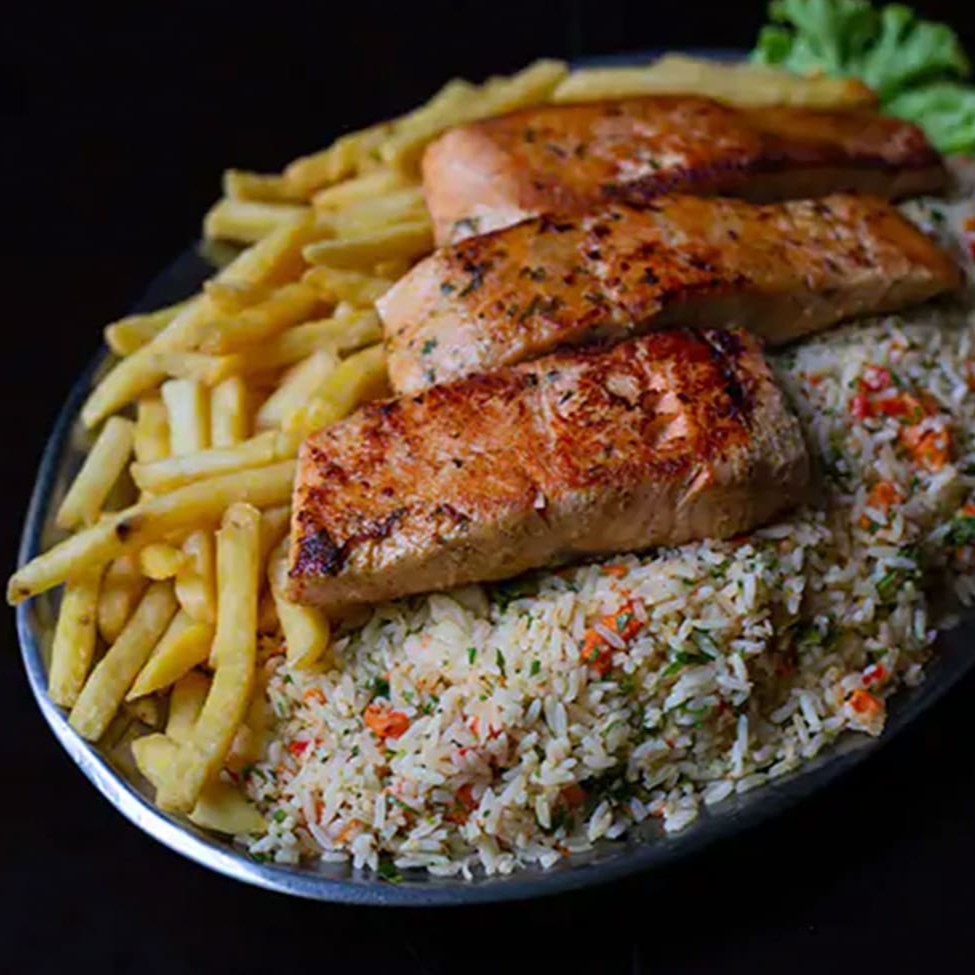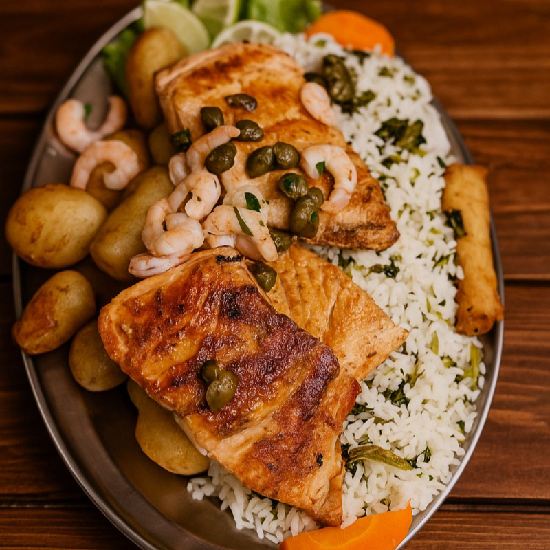 Salmão grelhado, cebola murcha no azeite, alcaparras, azeitonas verdes fatiada, camarão, champignon, Catupiry, Purê de batatas e arroz Branco.