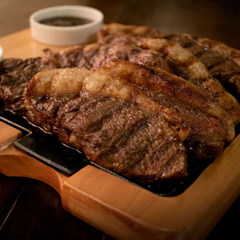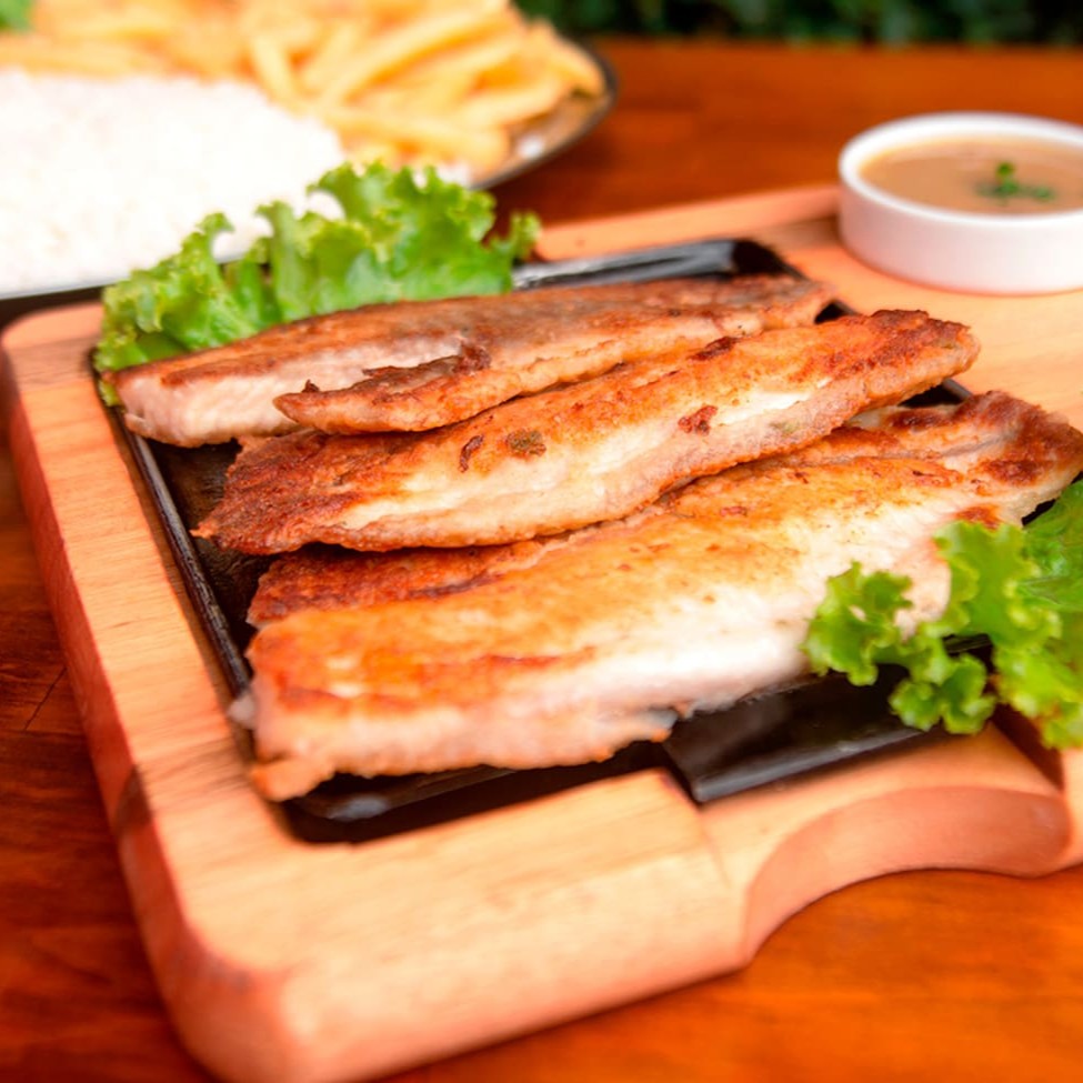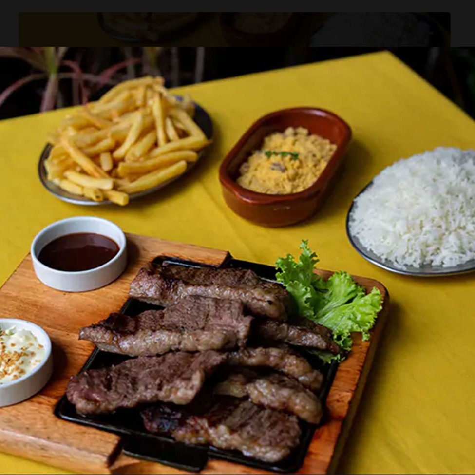 Picanha Grelhada, Mandioca Premium. Acompanha arroz com carne seca, calabresa, bacon e milho.