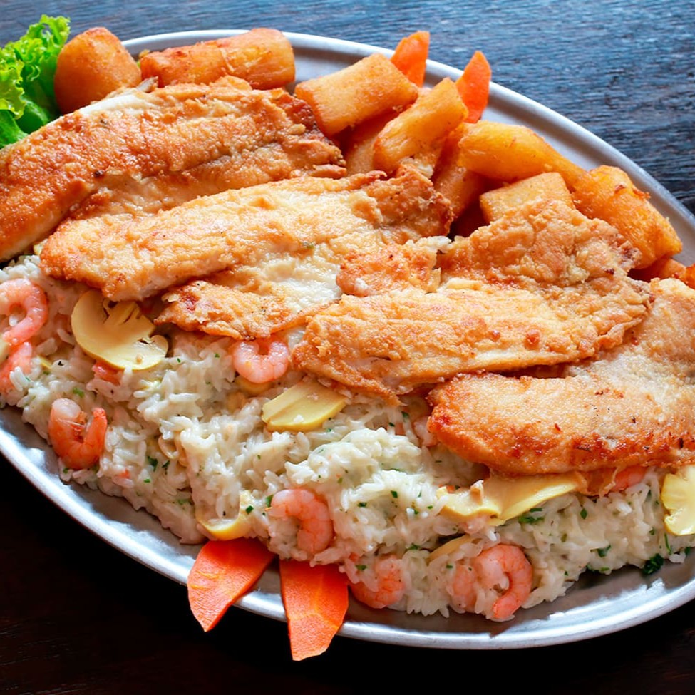 Tilápia grelhada, mandioca frita, risoto ao molho branco puxado no vinho branco com champignon e camarão.
