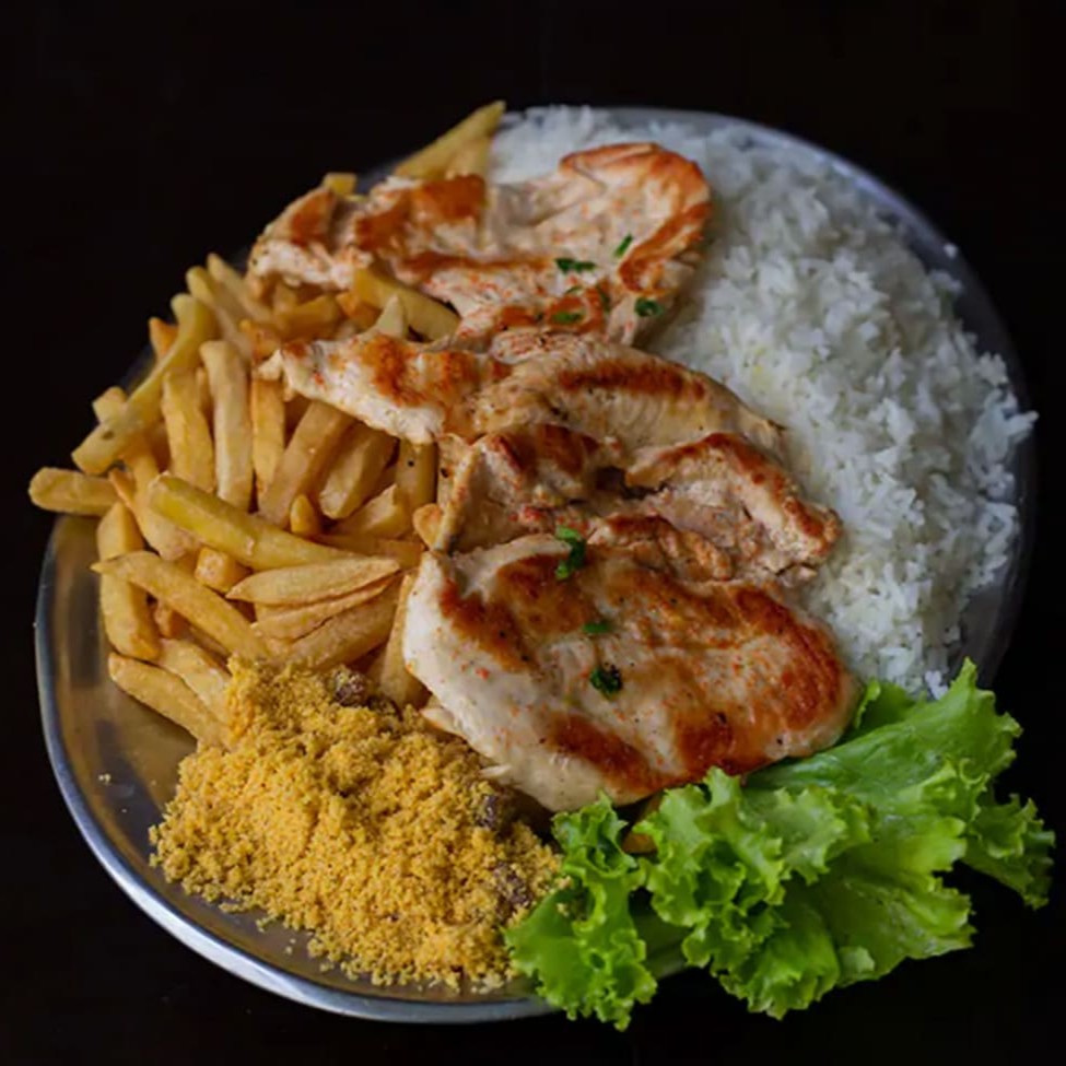 Peito de frango grelhado, farofa, batata frita e arroz branco.