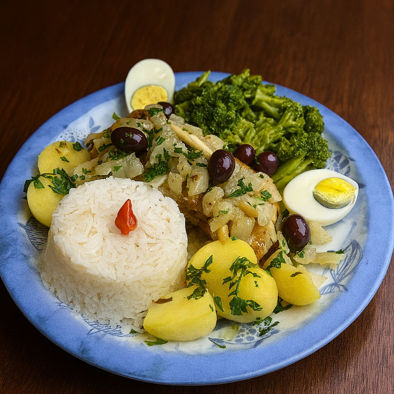 Bacalhau grelhado com cebola murcha, brócolis, ovos, batatas cozidas, azeitonas pretas e arroz branco.