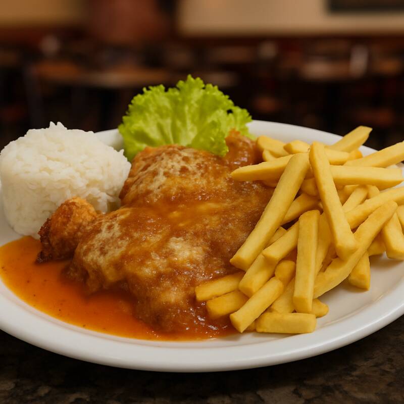 Filé de frango à parmegiana com molho de tomate coberto de mussarela gratinada, arroz branco e fritas.