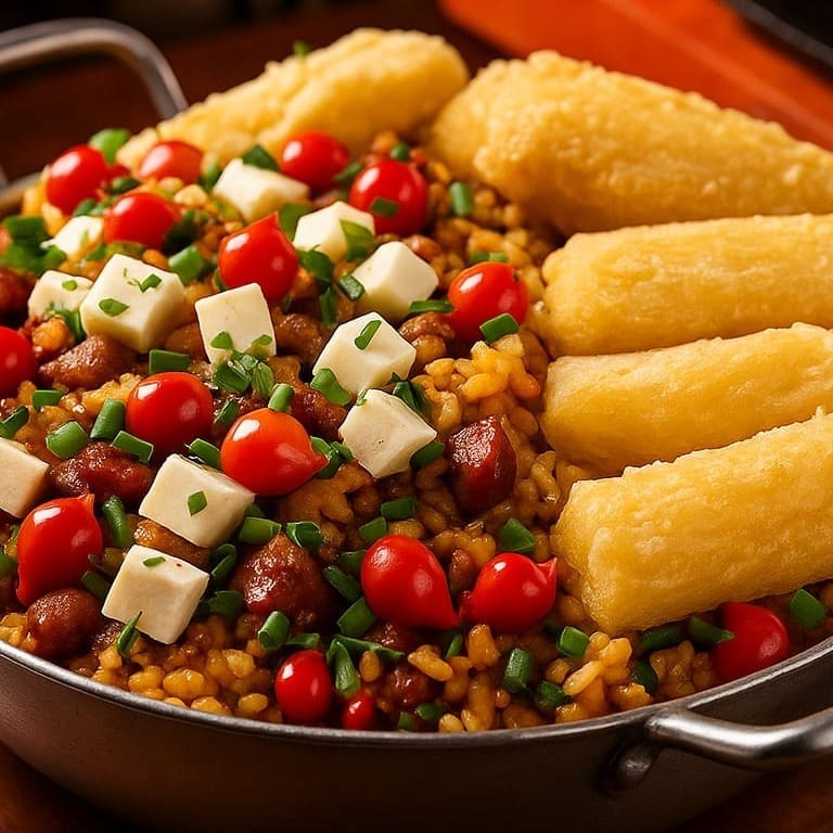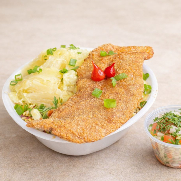 Arroz, file de frango empanado, molho de tomate da casa, queijo derretido e fritas. finalizado com cebolinha e pimenta biquinho