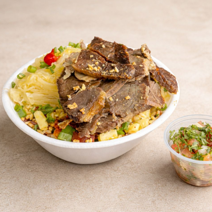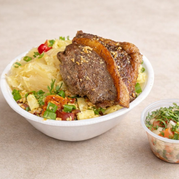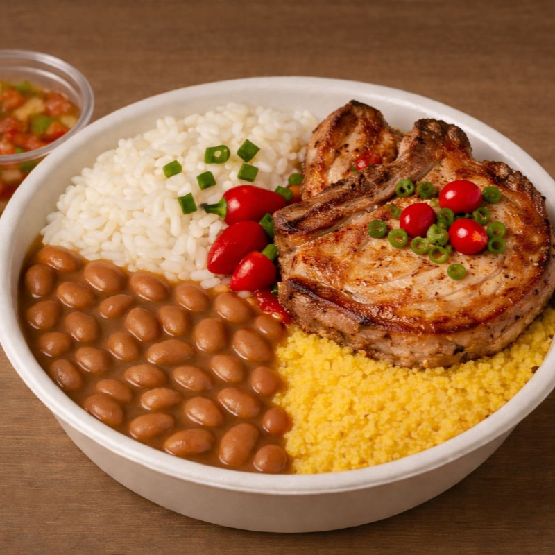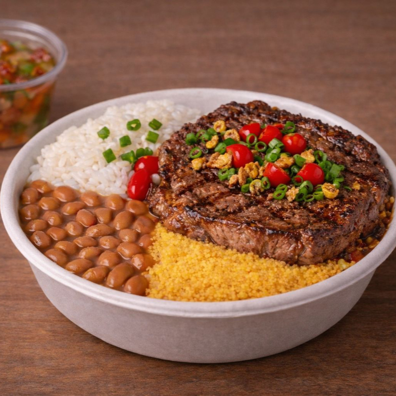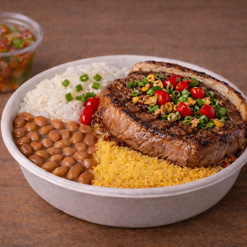 Suculenta fatia de picanha grelhada no ponto certo, acompanhadas de arroz soltinho, feijão caseiro, farofa crocrante. Finalizada com cebolinha e um toque de pimenta biquinho. Uma explosão de sabor!