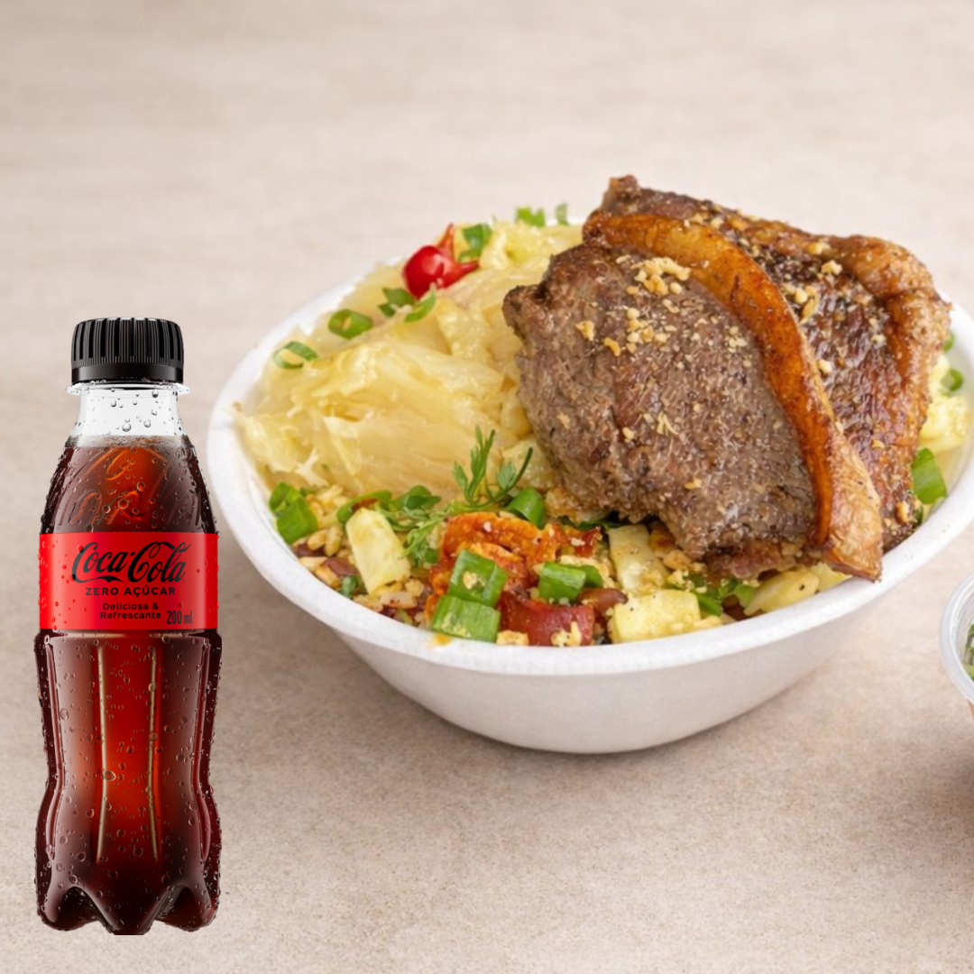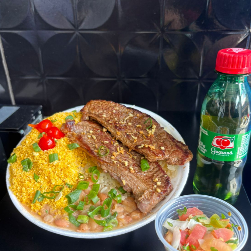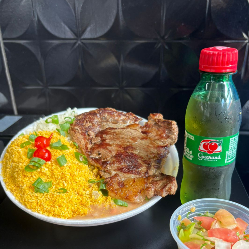Delicioso bife de contra file, arroz branco, feijão fresquinho, farofa crocante e vinagrete, finalizado com alho frito, pimenta biquinho e cebolinha. + 1 refri guaraná 200ml TOTALMENTE GRÁTIS