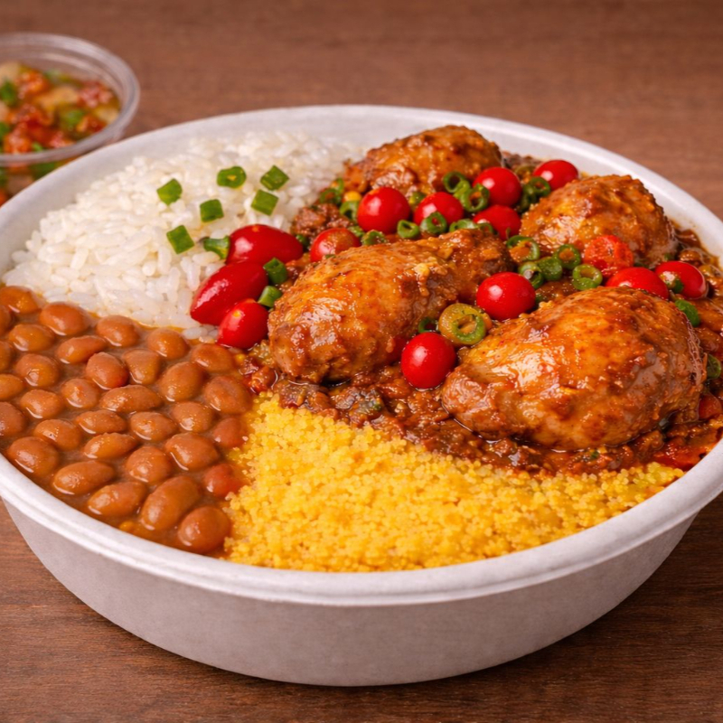 arroz branco, feijão de caldo fresquinho, farofa e vinagrete. finalizado com cebolinha e pimenta biquinho. ( indicado pra 1 pessoa)