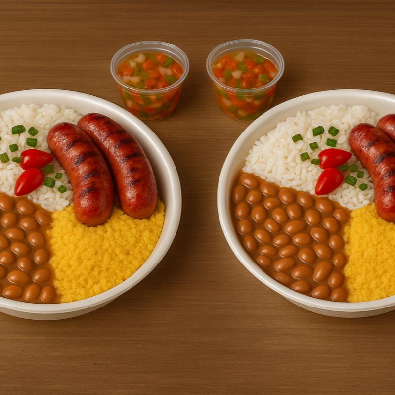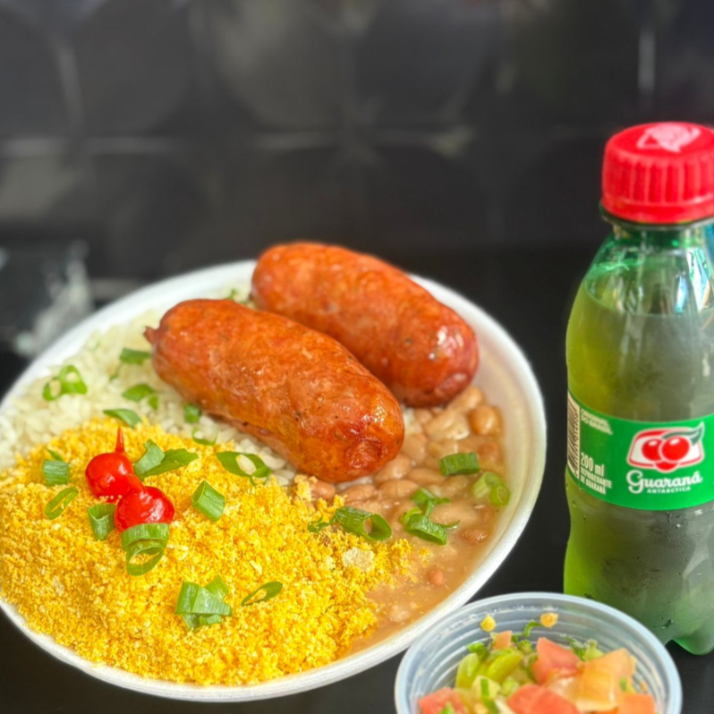 Deliciosa linguiça de costela bovina, servido com arroz soltinho, feijão tropeiro, mandioca cozida e frita na manteiga e vinagrete. Finalizado com cebolinha e pimenta biquinho. Uma Delicia!!
