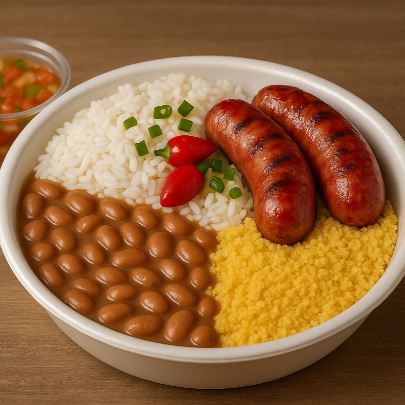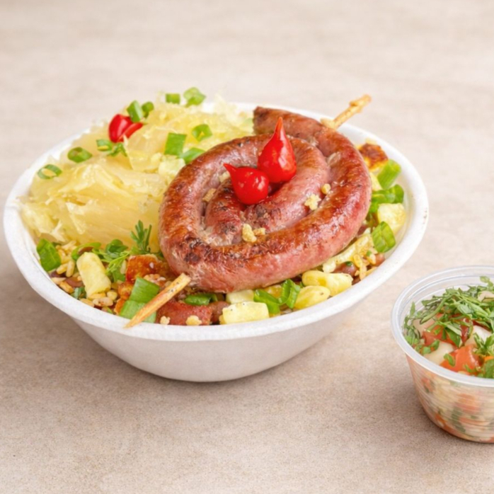 Deliciosa linguiça de costela bovina, servido com arroz soltinho, feijão tropeiro, mandioca cozida e frita na manteiga e Finalizado com cebolinha e pimenta biquinho. Uma Delicia!!