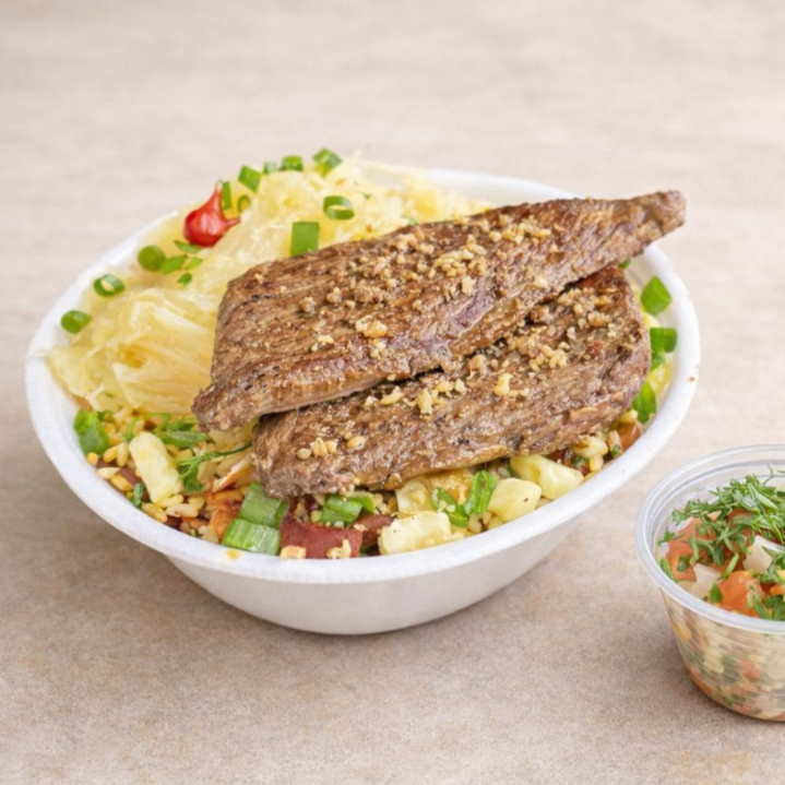 Nosso Delicioso Baião De Dois, É Feito Com Linguiça Defumada, Cebola, Arroz, Feijão De Corda Legitimo, queijo coalho, Regado Com Manteiga De Garrafa Pra Deixar Aquele Sabor Inconfudivel, Tempero Baiano, Coloral E Salsinha. Acompanha Mandioca Frita Na Manteiga E Vinagrete e dois bifes de picanha, Finalizado Com Cebolinha E Pimenta Biquinho.