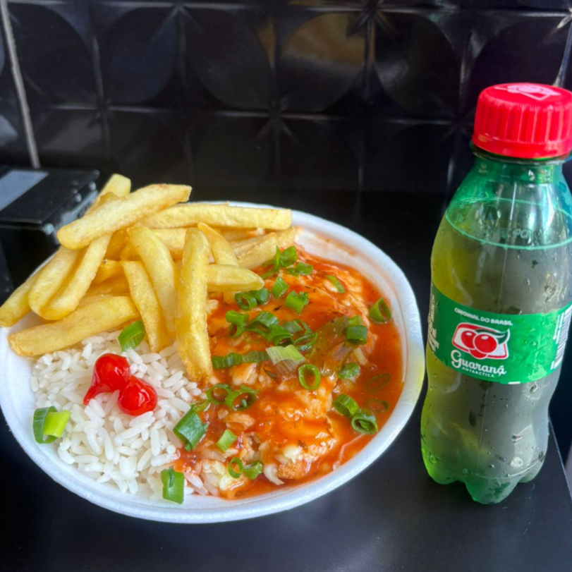 Delicioso e suculento gomos de toscana frita, arroz, feijão fresquinho, farofa e vinagrete, finalizada com alho frito, pimenta biquinho e cebolinha. + 1 guarana 200ml GRATÍS!