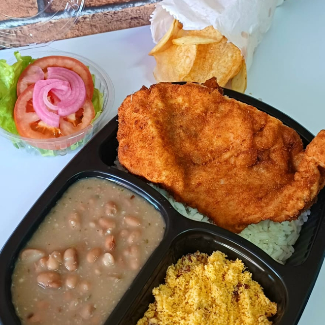 Acompanhado de arroz, feijão fresquinho, nossa farofa da casa e uma saladinha fresca do Dia.
