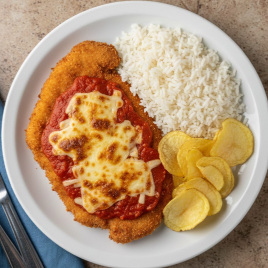 Parmeggiana de Frango, acompanha arroz e CHIP´S