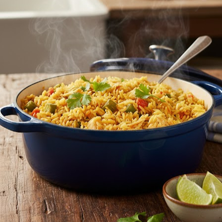 Arroz puxado com quiabo, galinha desfiada e finalizado com tomates picados
