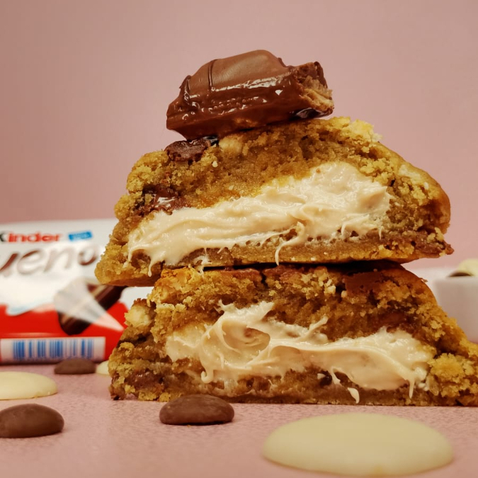 Cookie com massa artesanal com gotas de chocolate nobre ao leite e chocolate branco e recheado com muito creme de Kinder Bueno. Assados na hora. Para uma experiência melhor, consumir morno. ---------- tags --------- Cookies , cookies recheados , doces , sobremesas , 0800 , grátis , chocolate , Ninho com Nutella , morango , Prestígio , coco , sensação , bolo de pote , copo da felicidade , cone , brownie , brawnie , brauni , trufa , geladinho gourmet , açaí , acai , assai , donut , coxinha , frango , costela , cream Cheese , carupiry , requeijão, risole , mini salgado , esfiha , coca , refrigerante , desconto , promoção , promocao , coxinha de morango , bombom de morango , bombom de uva , Kinder Bueno , Ferrero Rocher , red Velvet , pistache , espetinho
