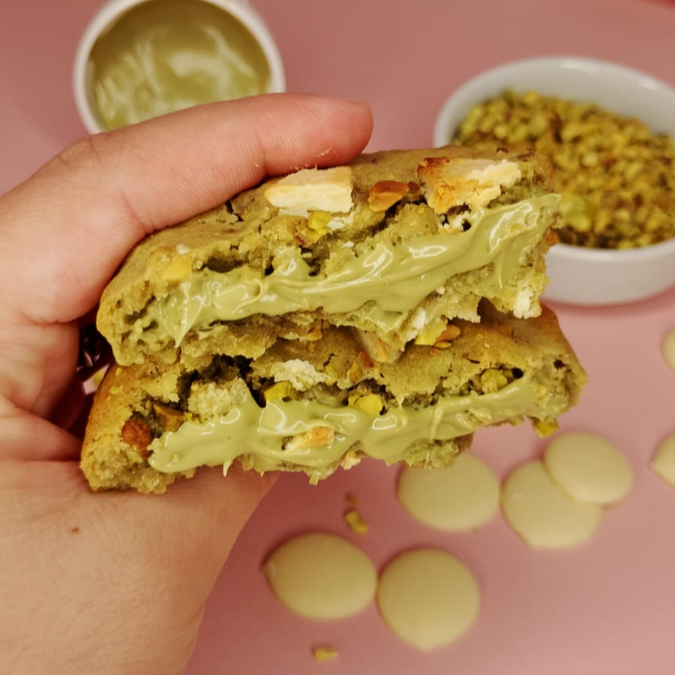 Cookie com massa artesanal de pistache, contendo pistache triturado e gotas de chocolate nobre branco, com recheio de uma delicioso creme de pistache. Assados na hora, para uma experiência melhor, consumir morno. ---------- tags --------- Cookies , cookies recheados , doces , sobremesas , 0800 , grátis , chocolate , Ninho com Nutella , morango , Prestígio , coco , sensação , bolo de pote , copo da felicidade , cone , brownie , brawnie , brauni , trufa , geladinho gourmet , açaí , acai , assai , donut , coxinha , frango , costela , cream Cheese , carupiry , requeijão, risole , mini salgado , esfiha , coca , refrigerante , desconto , promoção , promocao , coxinha de morango , bombom de morango , bombom de uva , Kinder Bueno , Ferrero Rocher , red Velvet , pistache , espetinho , bolo caseiro , cenoura , aniversário , festa , brigadeiro , gourmet