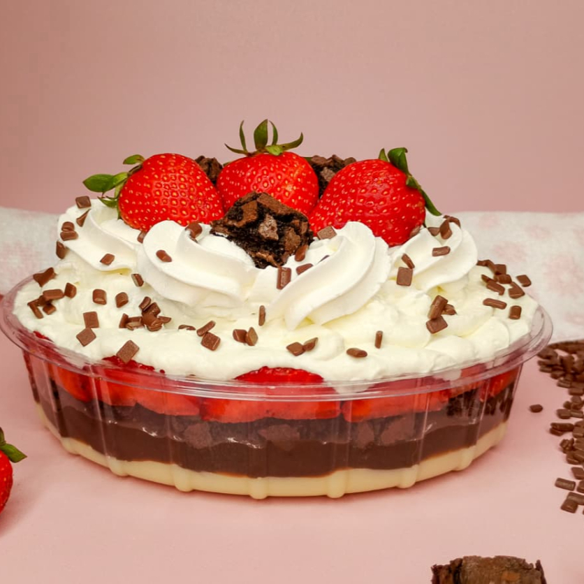 Sobremesa inspirada no nosso copo da Felicidade, composta por: Brigadeiro gourmet cremoso ao leite, brigadeiro cremoso de Ninho, Brownie, morango fresco picado, mousse aerada de Ninho, morangos, granule e chantilly para finalizar. Serve de 4 a 6 pessoas. Peso Médio 700g