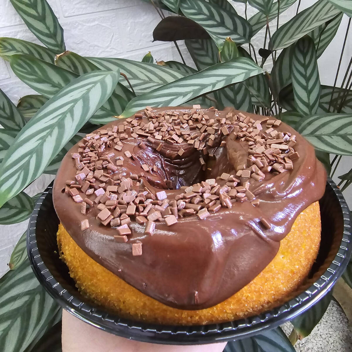 Bolo de cenoura com Ganache blend e Granulé ao leite Serve bem ate 6 pessoas! Aproximadamente 800g Serve 4 pessoas (800g)