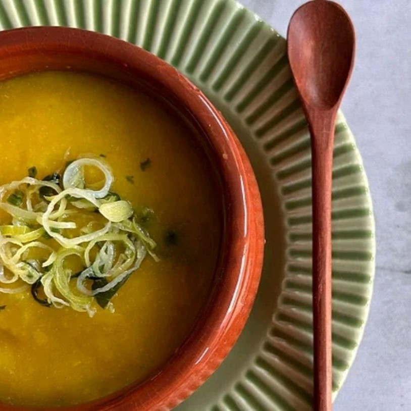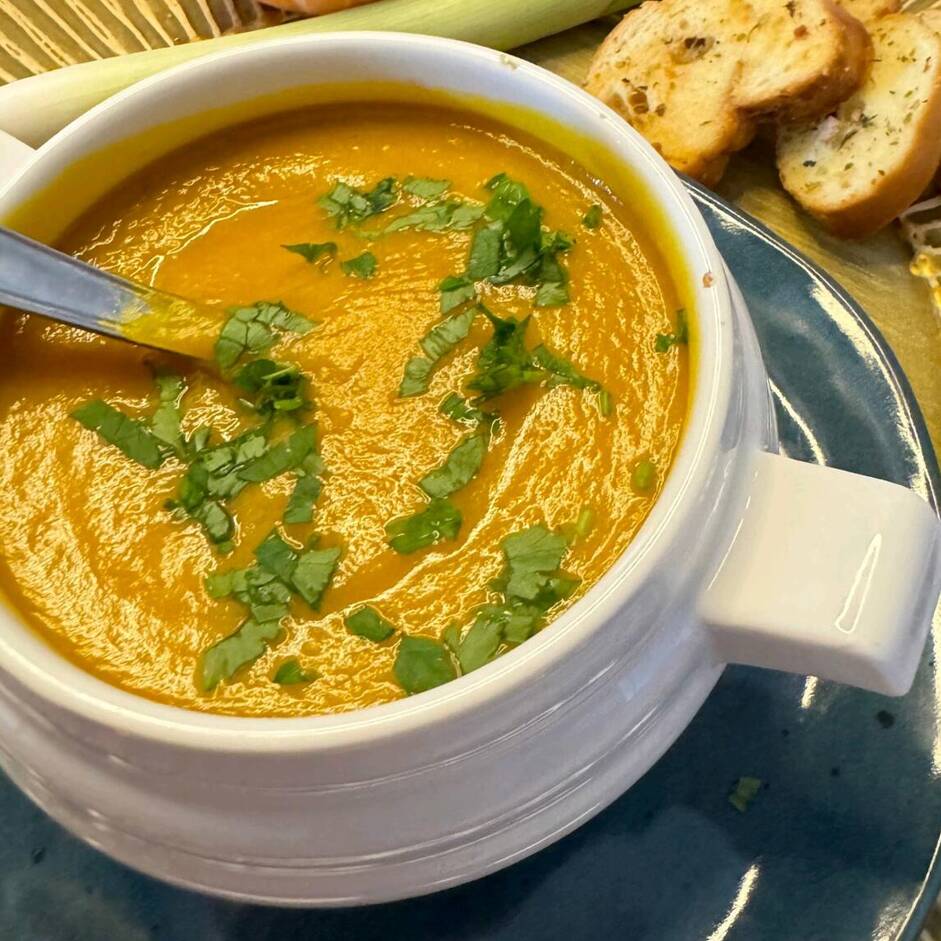 Nosso irresistível Creme de Abóbora com Alho-poró. Acompanha torradas