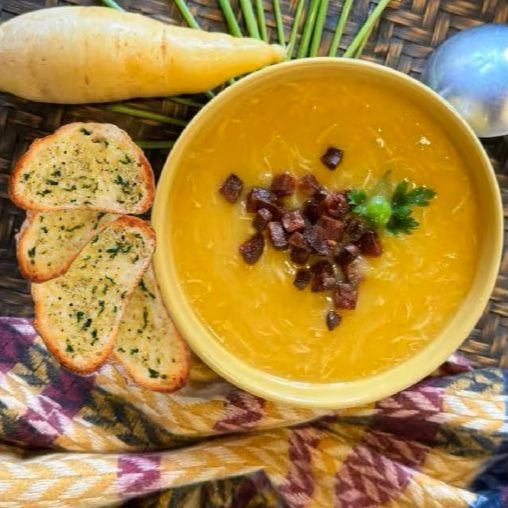 •Nosso creme de abóbora é uma combinação perfeita de simplicidade e sabor. Acompanha torradas •Feito com abóbora fresca, este caldo é suave, cremoso e naturalmente doce, proporcionando uma experiência culinária rica e satisfatória. A abóbora, quando cozida e batida, transforma-se em um creme aveludado, com uma cor vibrante que enche os olhos e aquece o coração.