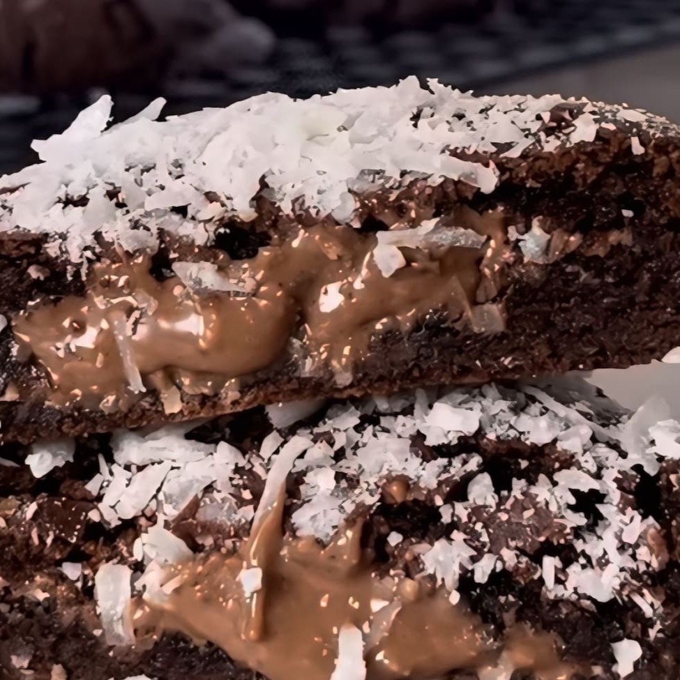 Massa de Chocolate (feito à base de cacau 70%) com gotas de avelã, recheado com creme de coco queimado com lascas de coco por cima