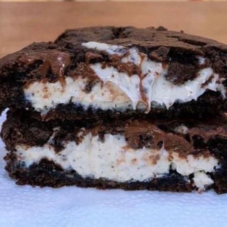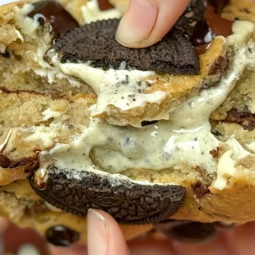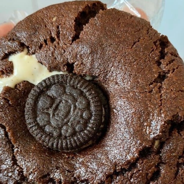 Massa de leite Ninho com gotas de avelã, recheado com pasta de laka Oreo com uma bolacha Oreo em cima