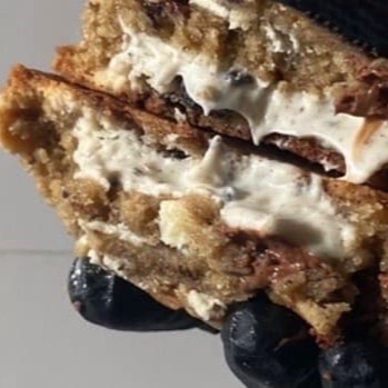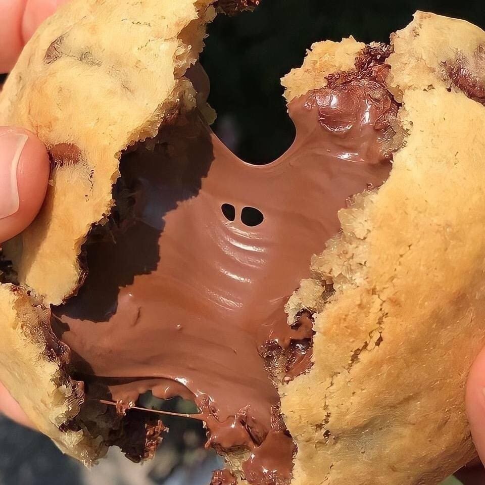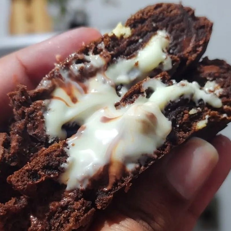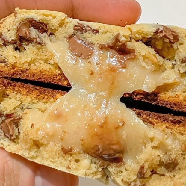 Massa de leite Ninho com gotas de avelã recheado com galak Negresco com pedaços de bolacha Negresco dentro e por cima do cookie