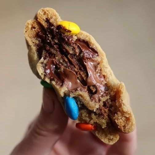 Massa de leite Ninho com gotas de avelã, recheado com Nutella e M&M por dentro, com cobertura de M&M por cima