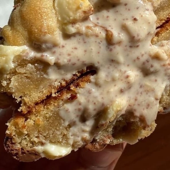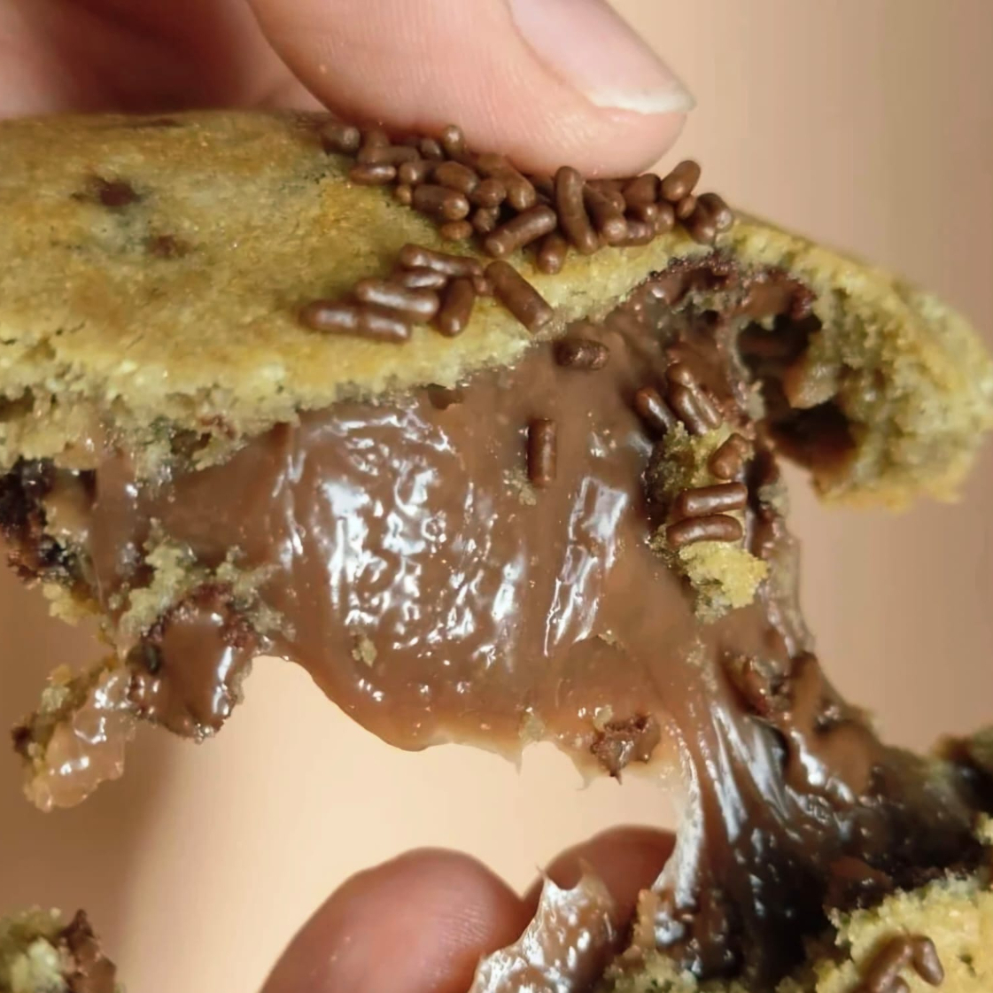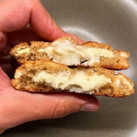 Massa de leite Ninho com gotas de avelã recheado com creme de canela com canela por dentro e por cima do cookie