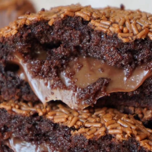Massa de chocolate (feito à base de cacau 70%) com gotas de avelã recheado com creme de brigadeiro moça com cobertura de granulado
