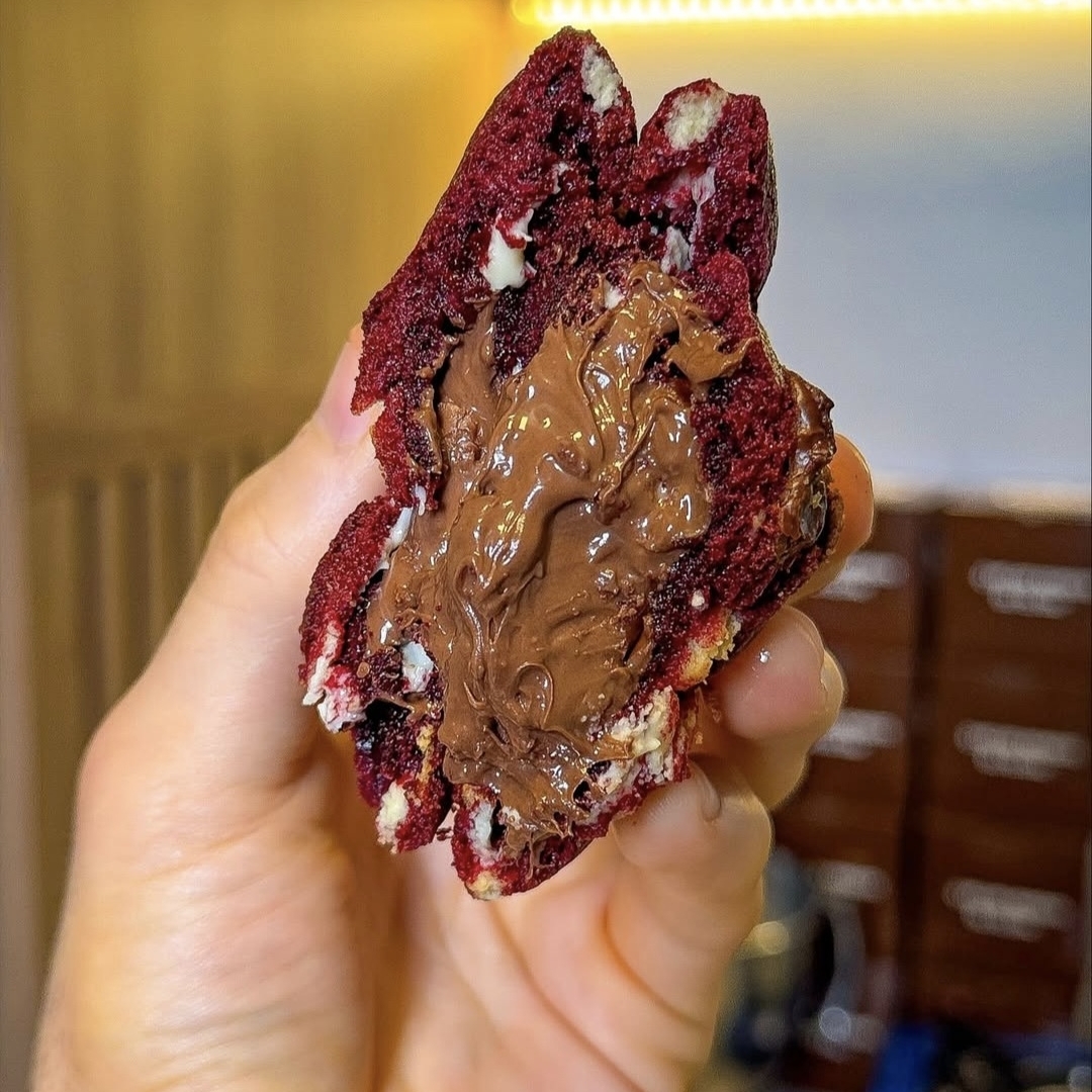 Massa de Red Velvet com gotas de chocolate branco nobre e recheado com Nutella