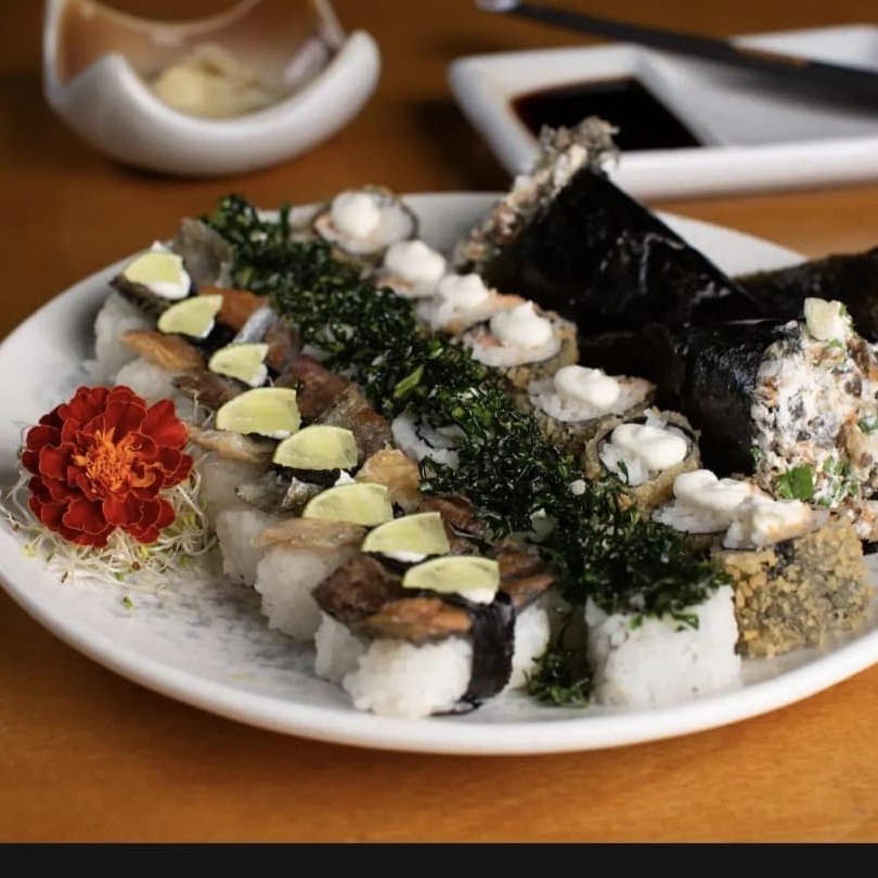 Manga, sunomonu, atum, shimeji, cebola roxa, creme chesse, batata crispy, shari, tomate cereja, gergilim, couve crispy
